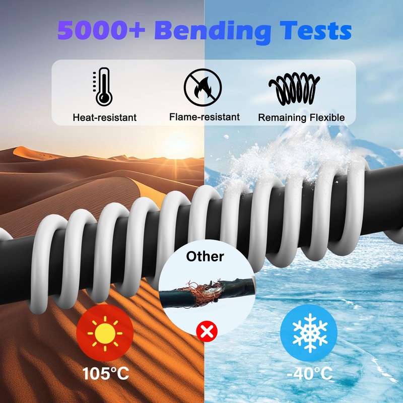 - High Performance: This 18 gauge 3-prong power extension cord is rated for 125V/10A/1250W, providing sufficient power for most household appliances----Multi-stranded oxygen-free copper wire enhances conductivity by 30%, significantly reducing heat generation and energy loss----Both plug ends and cable are ETL certified, strictly complying with U.S. electrical standards----Features thickened flame-retardant insulation layer, heat resistant up to 105°C, ensuring long-term safe use without overheating or melting----Thickened nickel-plated prongs are wear-resistant, easy to plug and unplug, and resistant to bending or deformation