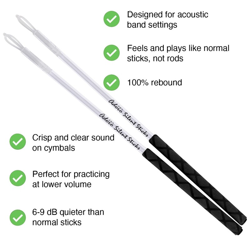 - Sound like Normal Sticks: The problem with other sticks that reduce volume, such as wood rods, is that they sound different than a normal stick. Adoro Silent Sticks give you a crisp sound on drums and on cymbals. Great to have in your arsenal of drum accessories.