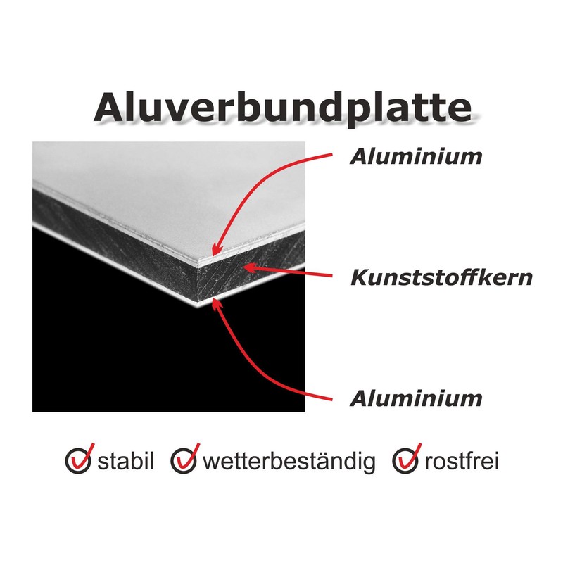 - Design: The sign is made from a sturdy 3 mm aluminium composite board. This consists of two outer layers of aluminium with a plastic core. The corners are not rounded.