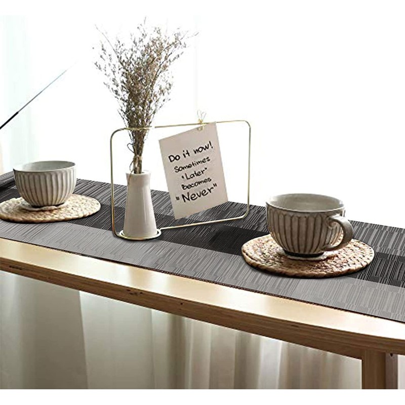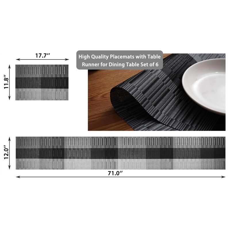 - Package: Set of 6 Placemats 18"x12"(45cmX30cm) and 1 piece table runner 12"x71", better match your table and give you a delight dining experience. Material: 70% PVC and 30% polyester yarn, which makes these place mats sets are eco-friendly and safe for dinner table use