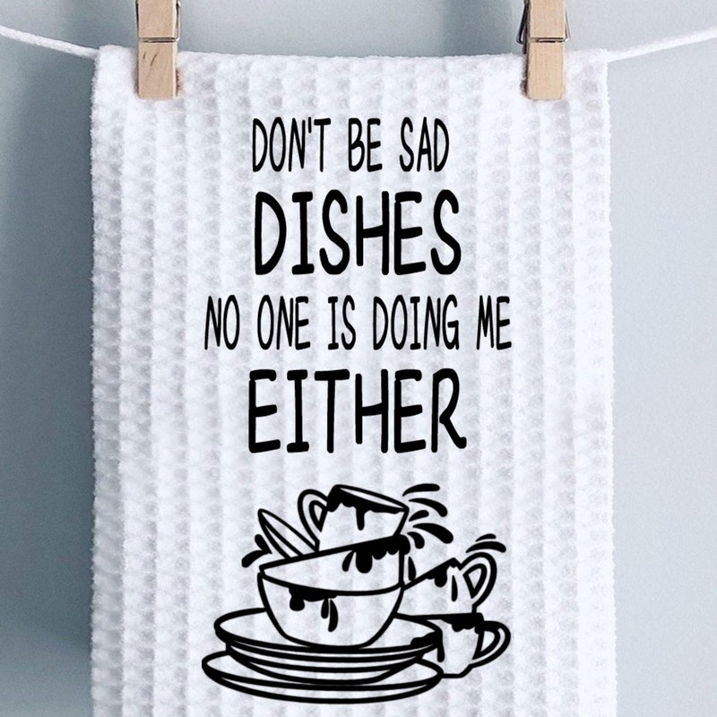 - Towel with saying: DON'T BE SAD DISHES NO ONE IS DOING ME EITHER.This towel will make an excellent gift for a housewarming, wedding, hostess or holiday stocking stuffer as well as many other occasions.