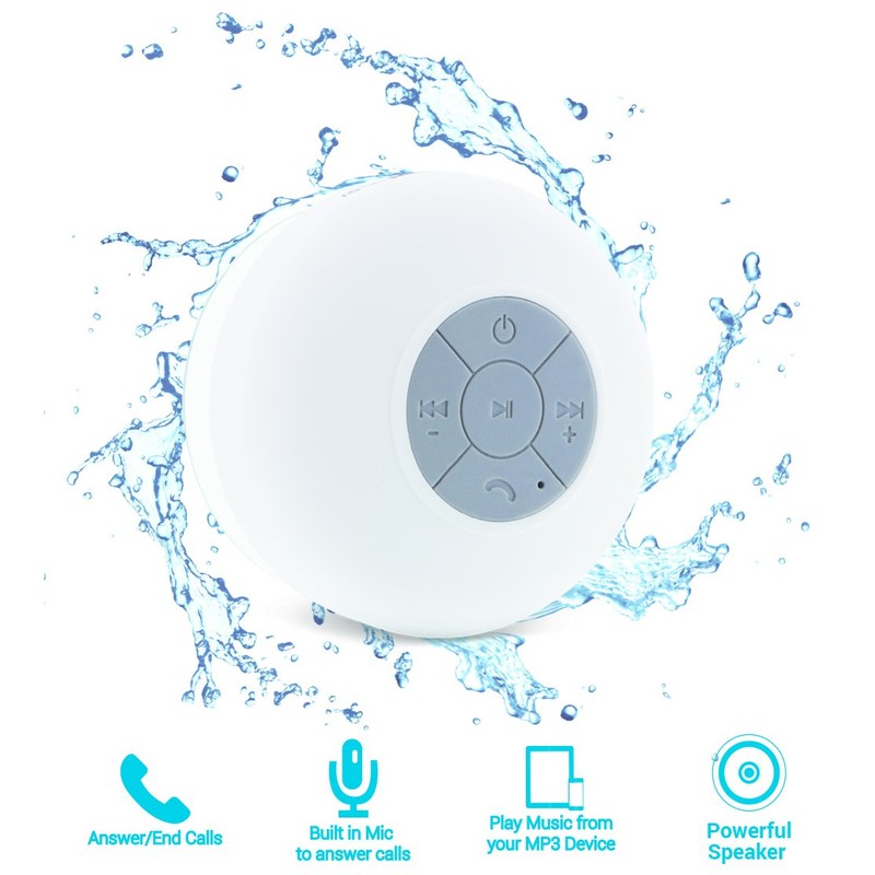 - Compatible con cualquier reproductor de MP3 de tablet de teléfono celular habilitado inalámbrico, etc. Salta canciones y adelante/atrás/pausa/reproducción directamente desde los altavoces resistentes al agua. Responde llamadas directamente en él y mantén una conversación a través del micrófono integrado. Cuenta con una ventosa para una fácil fijación a la pared o cualquier superficie plana. Ideal para duchas, baños, piscinas, barcos marinos. Certificado IPX4 | Dimensiones del producto: 4.4 x 2.7 x 8 pulgadas