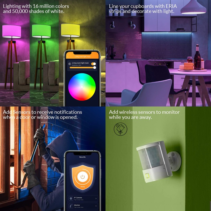 - Add ZigBee wireless smart lights to enable you to pick your colors, change the brightness, store and play your favorite lighting scenes, set timers, and control your lighting through the ERIA App or through your Voice with Amazon Alexa or Google Assistant. Compatible with ERIA, Hue, Sylvania, Cree, Tradfri, GE and Sengled ZigBee smart bulbs. (Note. Does Not work with Zwave devices!). (see a detailed compatibility list on our website).