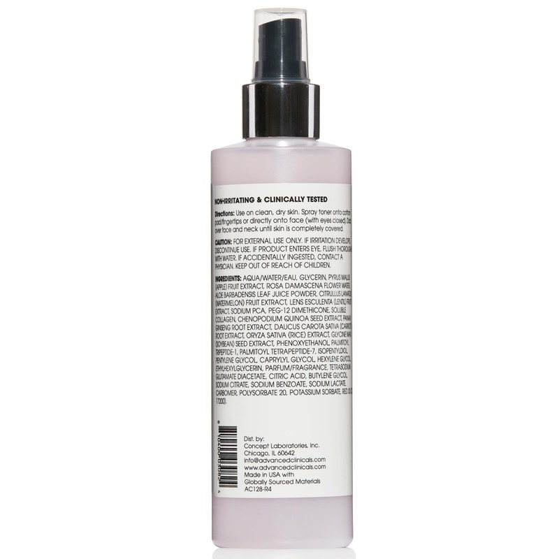 Stop Suffering from Dry SkinRestoring your skins moisture is no easy task. From your facial soap robbing your skin of moisture to oil building up throughout the day, your skin goes through a lot. But with Advanced Clinicals moisturizing Collagen + Rosewater Face Toner, skin becomes silky soft and incredibly hydrated! Anti-aging face mist doesn't only hydrate your skin but also helps tighten your skin to give your skin a firmer appearance.Concentrated Ingredients, Incredible ResultsOther rosewater or collagen mists rely solely on the main ingredient. At Advanced Clinicals, we take it a step further, combining the namesake ingredients with carefully chosen compounds found in nature to enhance the healing capabilities of this plumping toner mist: Lentil Fruit Extract increases skins moisture by drawing in the airs water droplets to pull it into the uppermost layers of skin. Rice Extract helps maintain beautiful skin since its loaded with essential vitamins, minerals, and amino acids. Blueberry Fruit Extract repairs damaged skin and increases new growth thanks to its plentiful antioxidants.Skincare Shouldn't be ComplicatedNo need to wake up early to add this spray to your skincare routine! With this face toner, you can moisturize anytime, anywhere. See and feel your skin become more hydrated with these simple steps: Cleanse your face, then pat it dry. Apply your toner. Close your eyes and spray a couple pumps of the Collagen + Rosewater Face Toner on your face & neck. Continue with your moisturizer and makeup. Freshen up your makeup and dose your skin with hydration throughout the day.