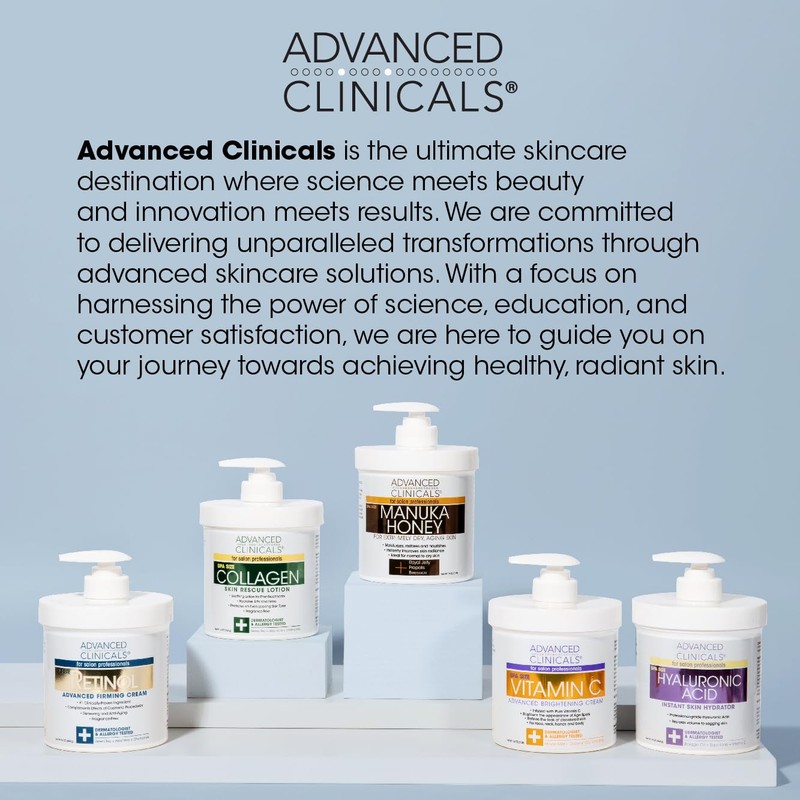 - LARGE SPA SIZE RETINOL FACE & BODY CREAM – With age our skin loses elasticity & moisture, this Advanced Clinicals Retinol Moisturizer Body Lotion & Face Cream is the perfect combination of anti aging ingredients with natural-antioxidants to help you promote more radiant skin & a more youthful look. Most retinol creams or other retinol products come in small 2 ounce or less jars that only last a short time, but this Retinol Cream comes in a large 16Oz Spa Size jar with a convenient to use pump.