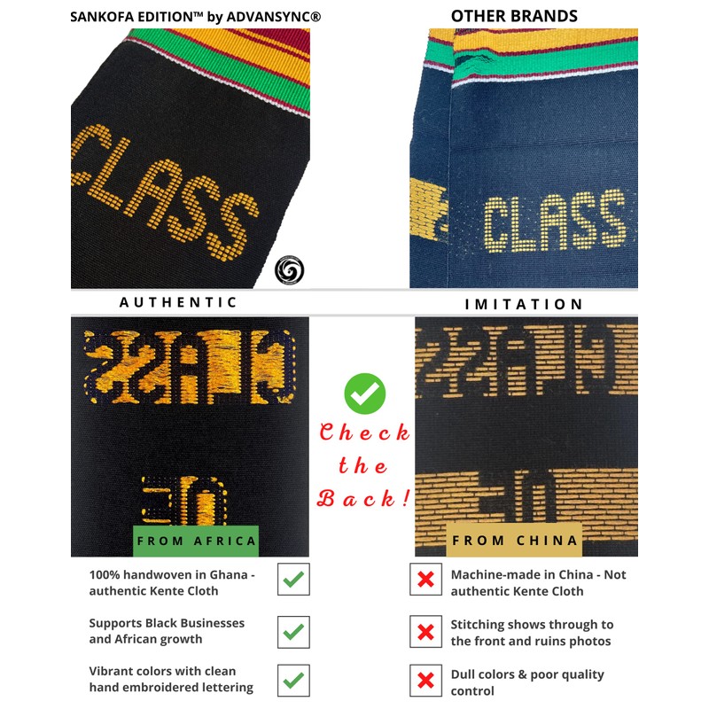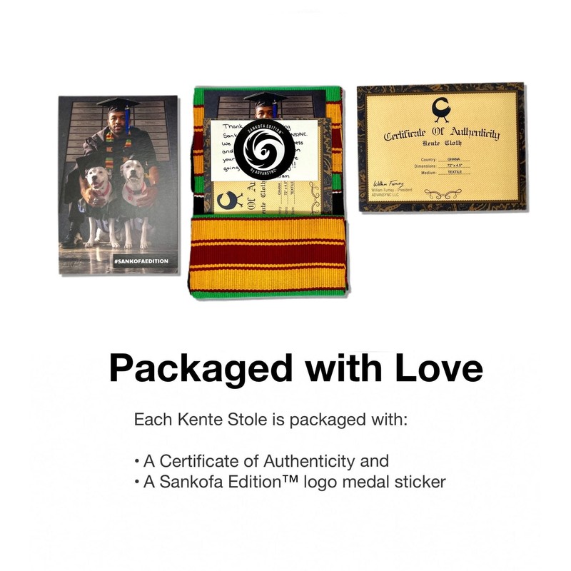 - REAL HAND-WOVEN KENTE CLOTH – This Sankofa Edition Kente Stole is hand-woven in Ghana, West Africa by skilled artisans with strict attention to detail – even the embroidery is carefully hand-stitched; Our Kente Cloth is made in the tradition of the Kente Cloths worn by Kings and Queens in Ghana and is the perfect graduation gift and keepsake.