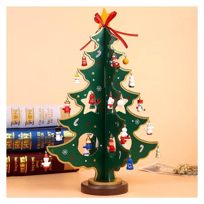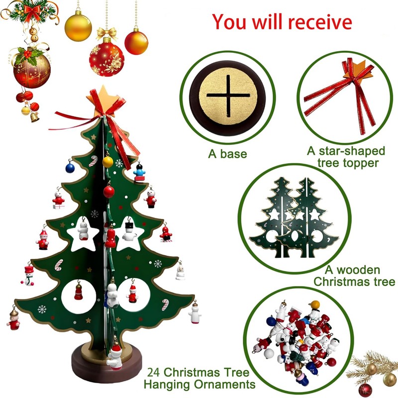 Christmas Tree Desktop Ornament - Coming in 2024 Desktop Wooden Christmas Tree Mini Christmas Tree Kit with 25 Decorative Pendants DIY Combination