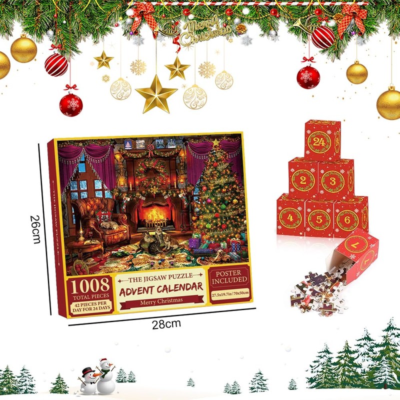- 2024 ADVENT CALENDAR PUZZLE This Christmas puzzle contains 24 numbered boxes with 1,008 pieces and a 1:1 color poster. Follow the numbers on the back of the poster to find the box corresponding to the position of the puzzle, and immerse yourself in the joy and wonder of Christmas.