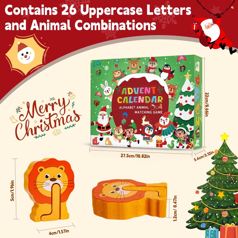 - 【Unique design for the Christmas animal letter matching game】Advent Calendar with Preschool Learning Activities Toys,The animal letter puzzle set contains 26 capital letters and 26 creative animal-shaped building blocks.Each of these letters corresponds to a unique animal building block, allowing children to match the letters to the animals based on shape and color information, e.g., C stands for cat. In addition, the bright colors and cute designs attract children's attention and promote their understanding of letters and animals.