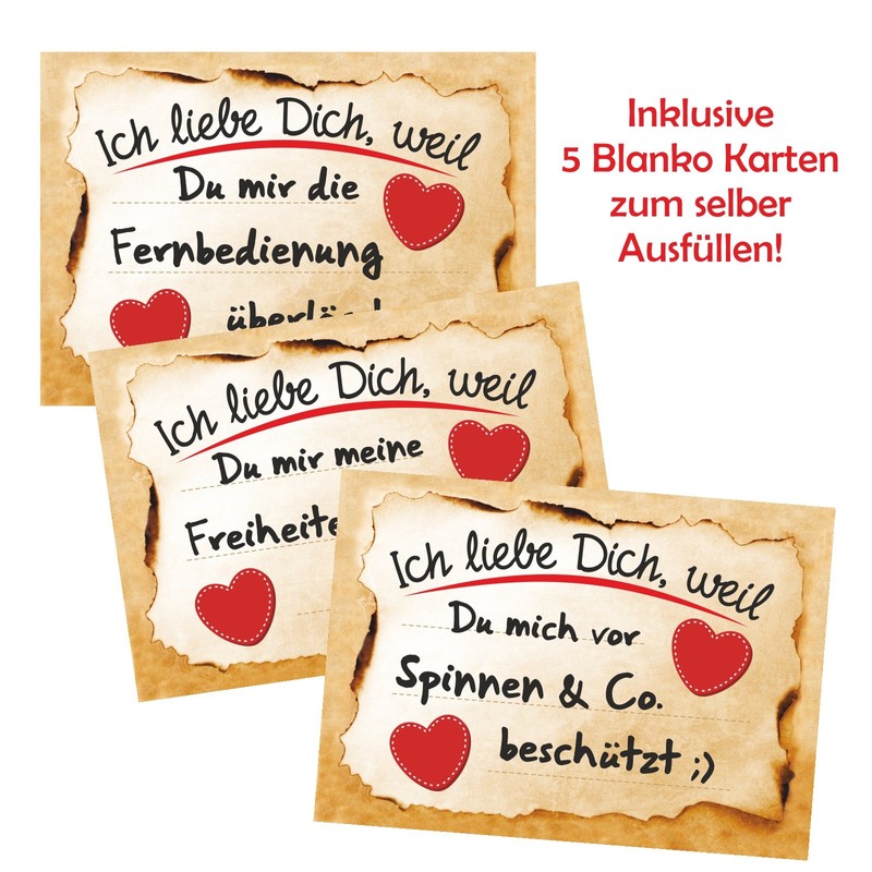 • The included cards are printed with 24 loving "I love you because ..." messages (examples see description text and photos) and do not have to be filled out laboriously. If a saying does not fit so well, it can be exchanged or supplemented with one of the included blank cards for labelling yourself. The love messages are gender-neutral and therefore suitable as a gift for men and women alike
