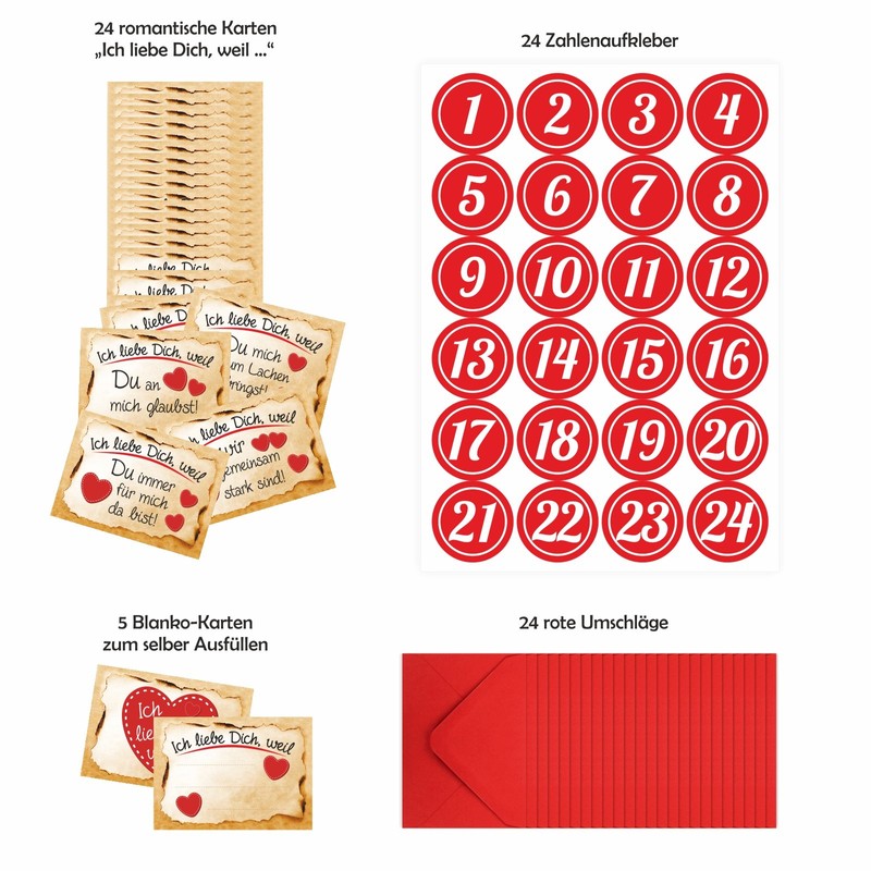 • The set includes: 24 high-quality printed and coated cards (7.4 x 10.5 cm = A7 large) made of solid cardboard with various reasons "Ich liebe Dich weil", 5 blank cards to fill in yourself for your own ideas, 24 matching red envelopes in the format C7 and 24 tear-resistant number stickers with a diameter of 4.5 cm