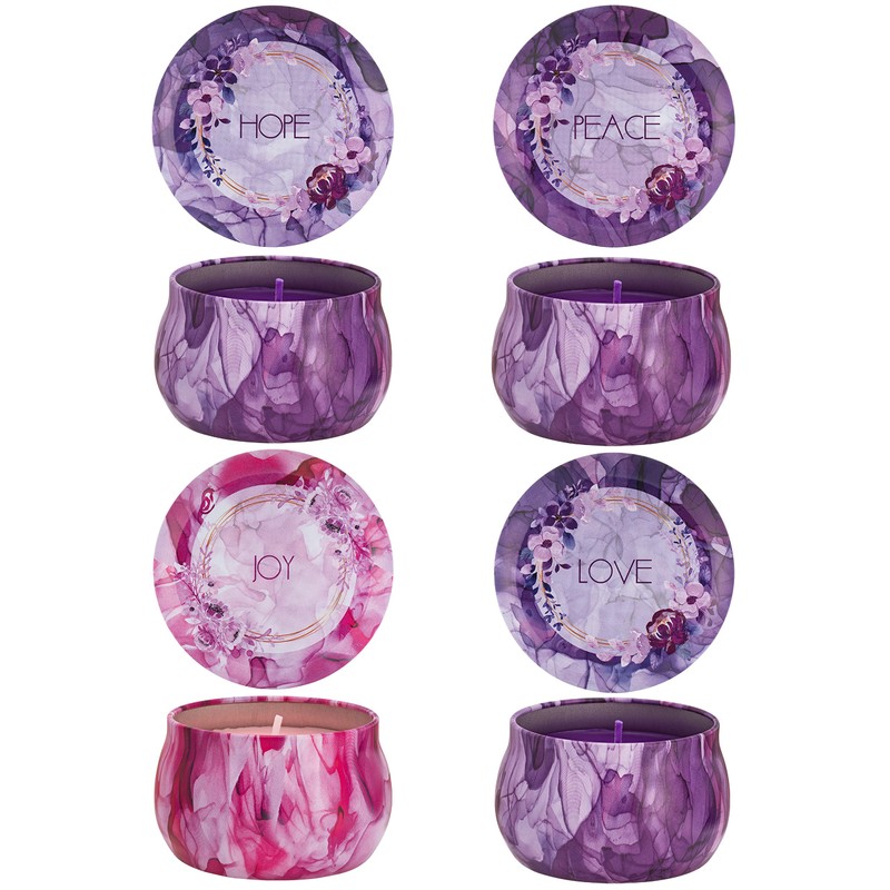Advent Candles Set of 4 – Advent Gifts – Advent Gift Candle Box - Love, Peace, Hope, Joy Printed On Canisters Tin Candles with Advent Colors Purple Pink - Candle Holder Wreath Ring for Pillar Candles