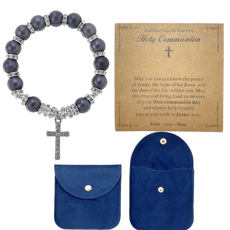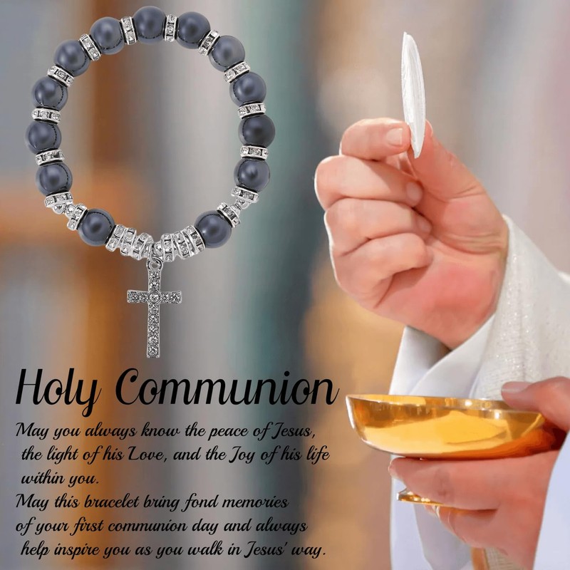 - First Communion Present for women:black glass bracelet combined cross holy charm that let him know he always connected to god. When he wears this bracelet he will have a reminder of him strength and god will always be with him.
