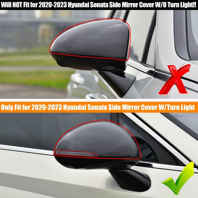 - 【Vehicles Compatibility】Compatible with Hyundai Sonata wing mirror cover glossy black right passenger side 2020 2021 2022 2023. Only fit for 2013-2020 Hyundai Sonata reareviw mirror cover W/turn signal light!!! Please confirm the model and year of the car carefully before placing an order. If you have any issues after receiving the product, please contact us promptly, and we will do our best to resolve the problem!