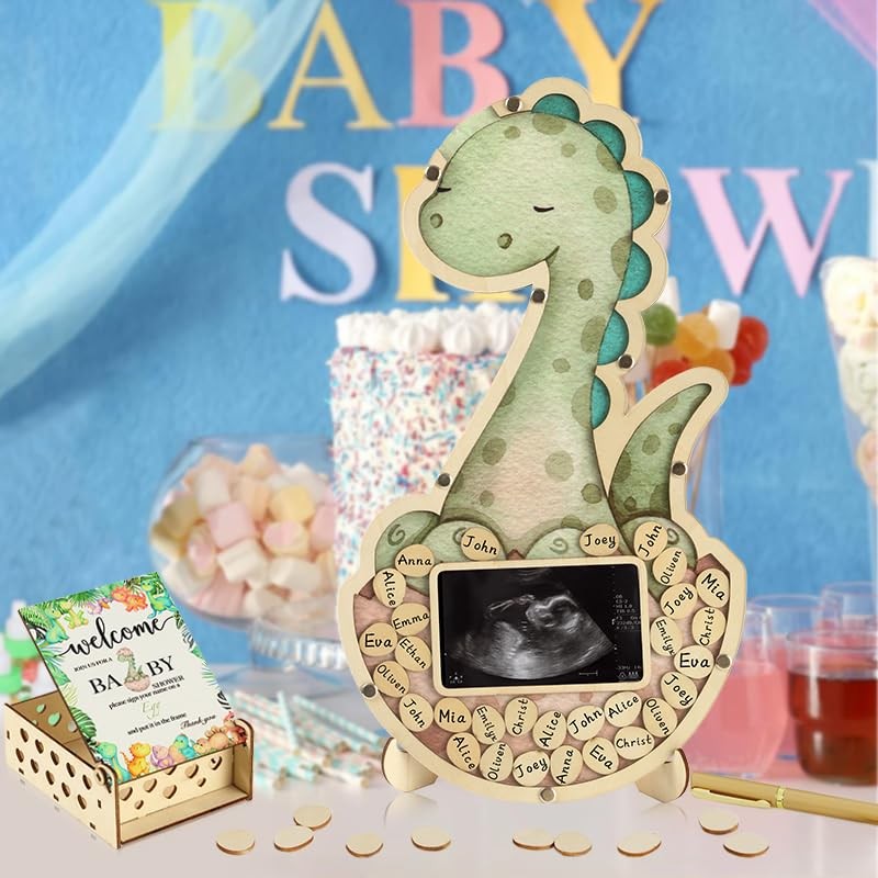 - Baby Birthday Shower Set: The dinosaur baby shower decorations include 1 dinosaur themed wooden picture frame with display stand, 1 dinosaur themed wooden box, 60 pcs wooden dinosaur egg slices, 1 golden pen (black ink), the practical set could well meet your various needs.