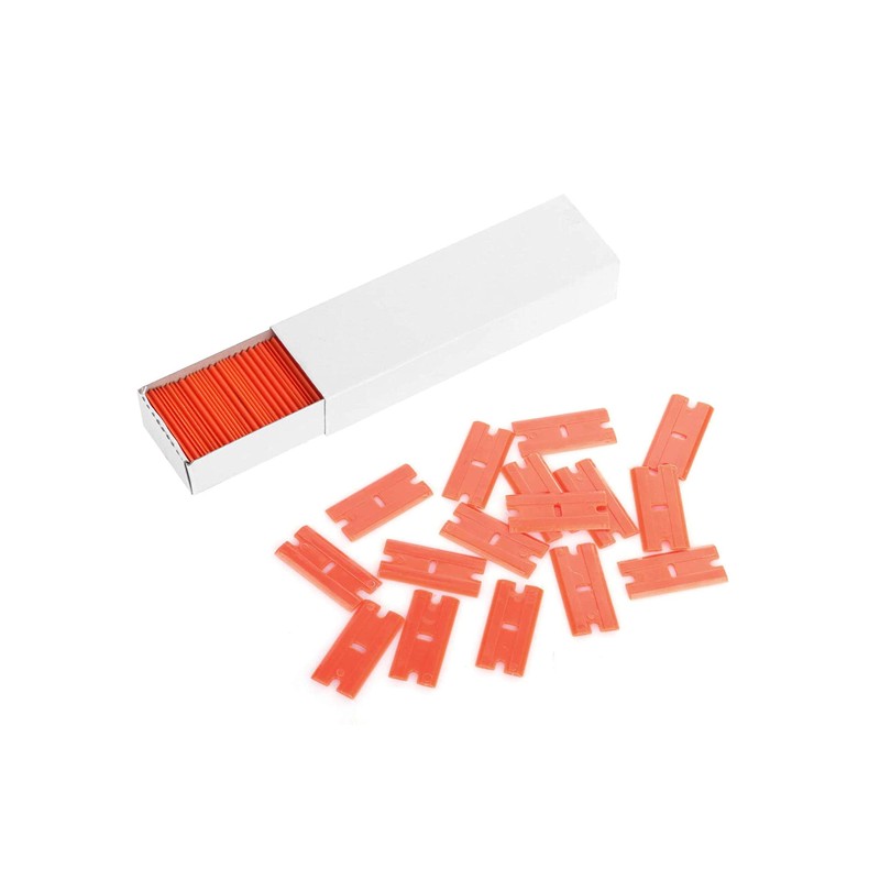 Mini Razor Blade Scrapers, Plastic razor blade scrapers do all the jobs for which you'd use a regular razor blade, but the plastic decal remover is much safer on paint, glass, plastics, aluminum and all other surfaces. Won't scratch the surfaces or your fingers. Comfort Fit Design Making Curved handle design for greater comfort and control, gives you a more substantial edge to grasp. Plastic razor blade scraper kit provides extra 100 pieces double sided razor blades so with each package of blades, you're getting twice as many usable edges. (Scraper can use both metal and plastic blades) Wide Application: Window Cleaning Car Bra Cleaning Tile Cleaning Glass Cleaning Appliance Glass Cleaning Decal Removal Glue Removal Adhesive Removal Residue Removal Sealant Removal Gasket Removal Wax Removal Caulk Removal Label Removal