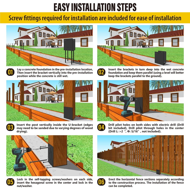 - SIMPLE INSTALLATION: All accessory screws (all made of 304 stainless steel) are included. 1.Insert the anchors into the wet concrete before the concrete is set; 2. After the concrete is dry, insert the wooden post into the bracket, drill the pre-drilled holes on both sides respectively and lock the screws; 3. Drill the through-holes in the wooden post with the drill in the middle and bottom, insert the screws into the wooden post and lock the nuts to complete the installation