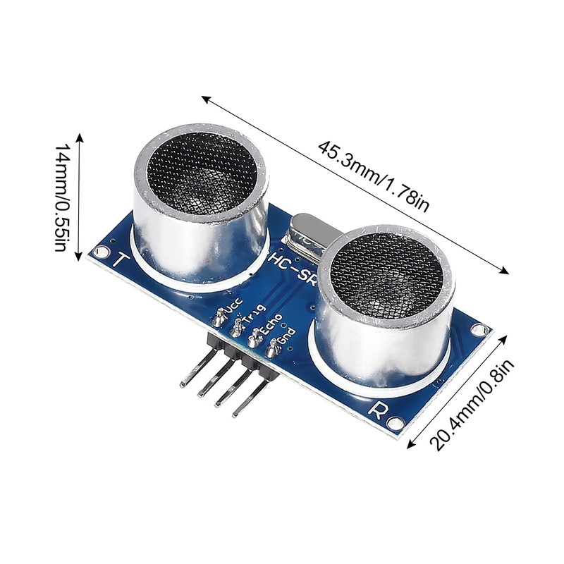 • HC-SR04 Ultrasonic Distance Sensor: Power Supply: 5V DC; Quiescent Current : <2mA; Effectual Angle: <15°; Detection Distance: 2 - 500cm; Resolution: 0.3cm