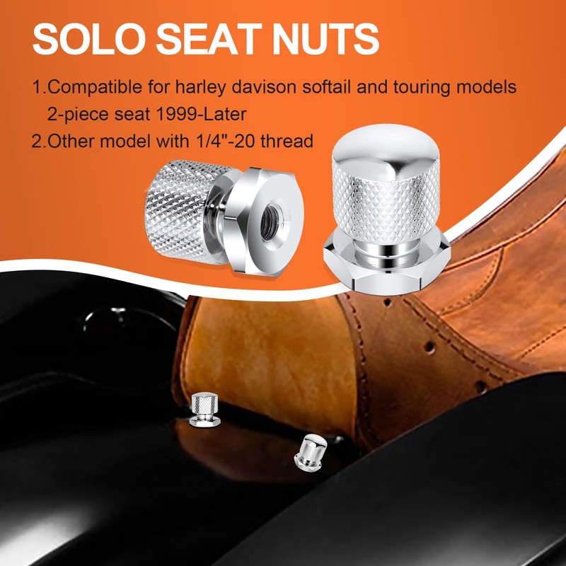 - Fitment - Aftermarket chrome solo seat nuts is compatible for 1996-Later Harley all softail and touring models equipment with 2-piece seat and knurled seat mounting nuts, or other models with 1/4"-20 thread. Will NOT WORK for the 1/4"-28 thread type