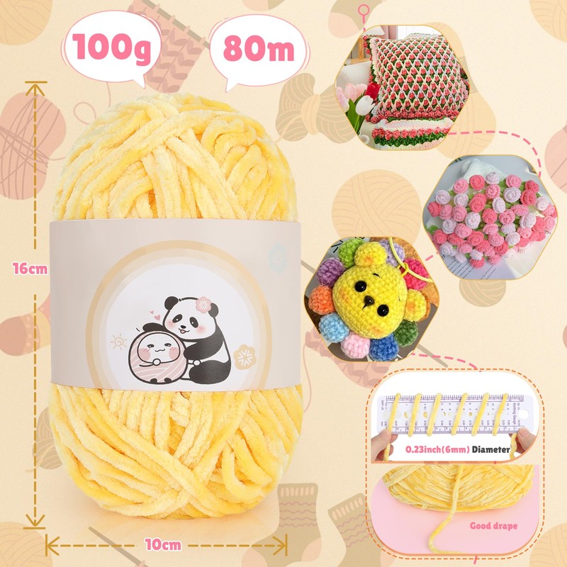 - Interesting chenille chunky yarn: the velvet velvet chunky yarn is really nice and soft, the colours are rich and beautiful, the chunky wool does not come off the yarn and is easy to work with when crocheting. Thanks to the quality of the wool, crocheting is really fun. Two baby wool for knitting soft, each yarn has 100 g, the chenille yarn has a diameter of 6 mm and a length of 80 m. This warm plush wool is suitable for 7-8 mm knitting needles and 4-6 mm crochet hooks