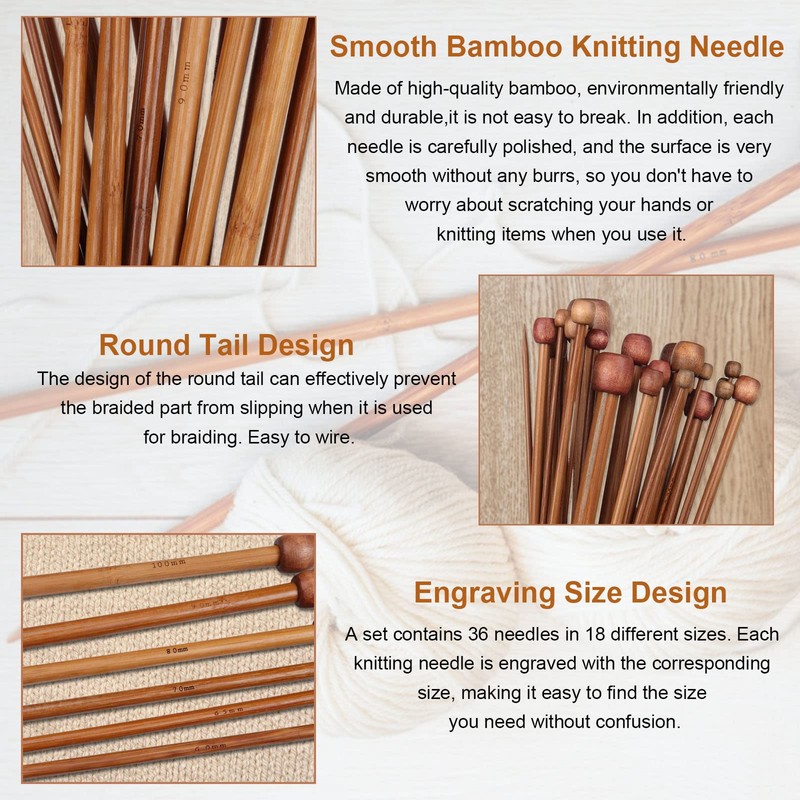 - [Bamboo Needles Knitting Set] All knitting needles are made of high quality eco-friendly bamboo wood material, lightweight, smooth to the touch and burr-free. The yarn/wool does slide up and down the needles with ease. Wooden needles would be warmer and easier to hold than steel. Easy to manipulate whilst knitting, comfortable to hold for long periods of knitting. Bamboo needles are perfect for people with arthritis, rheumatism or any form of joint pain or issues.