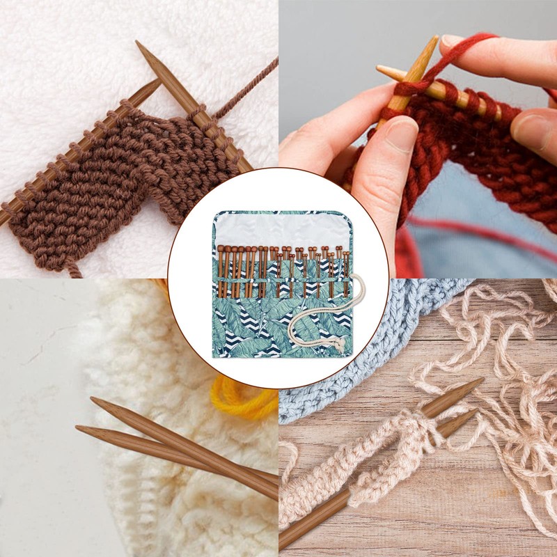 - [Knitting Needles Sets with Case] This knitting needle storage bag is made of soft high quality fabric and is very durable. Flip cover design, green leaves print pattern looks very pretty, and there are two twisted ropes that can be knotted at will to prevent needles from falling out. The knitting needles roll bag size is 38 x 38 cm with 20 slots, give plenty of space for your needles and keep everything neat and tidy. Don't worry that the bag won't roll up after it's full of bamboo needles.