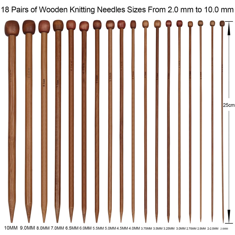 - [Short Knitting Needles Set Beginners-18 Different Sizes]This knitting needle set includes 18 pairs of bamboo needles of different thickness, sizes: 2.0 mm, 2.25 mm, 2.5 mm, 2.75 mm, 3.0 mm, 3.25 mm, 3.5 mm, 3.75 mm, 4.0 mm, 4.5 mm, 5.0 mm, 5.5 mm, 6.0 mm, 6.5 mm, 7.0 mm, 8.0 mm, 9.0 mm, 10.0 mm. The length is about 25 cm/9.8 in. As a novice or beginner, if you don't want to spend a fortune on needles but want to try a range of sizes, this set of bamboo knitting needles is your ideal choice.