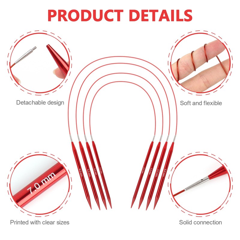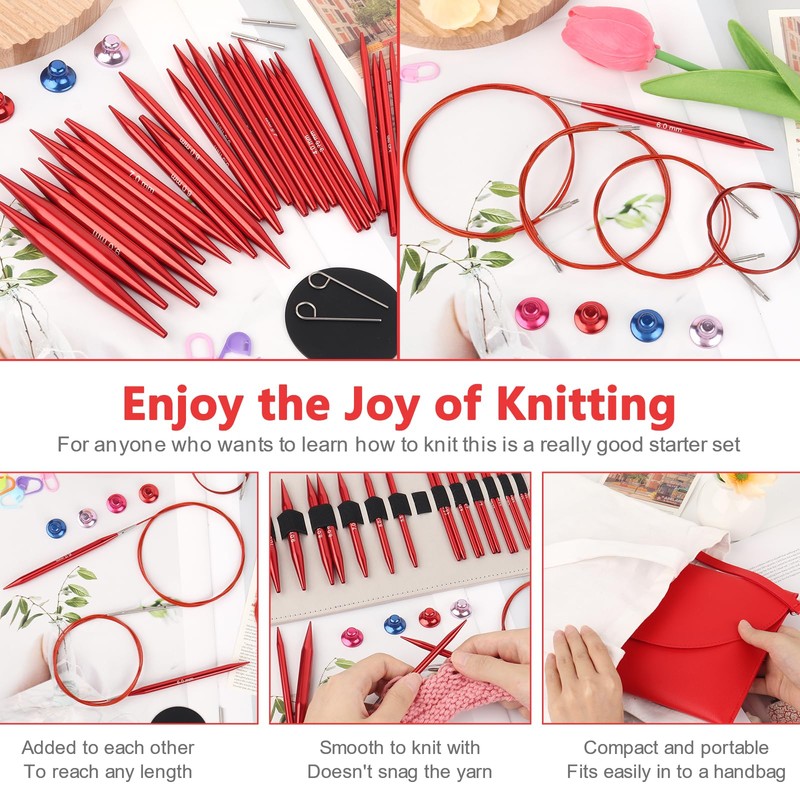 - Smooth Aluminum Knitting Needles Set: Made from aluminum, these knitting needles interchangeable are lightweight, smooth, and comfortable to hold, which can be ideal for long knitting sessions and easier on the hands. Smooth interchangeable round knitting needles with clearly printed size numbers, no snagging or catching of your wool, making it a joy to knit with. The red colours are also beautiful, which adds a nice touch to the knitting experience