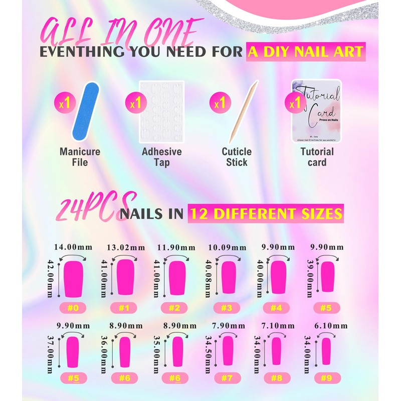 - 24 Fake Nails in 12 Sizes - Press Ons collection ensures a totally custom fit. Complete with essential nail file, cuticle pusher, jelly stickers. We've got you covered. Plus, a tutorial card for easy application