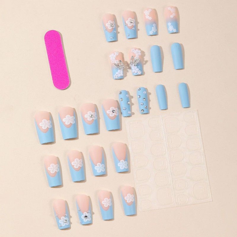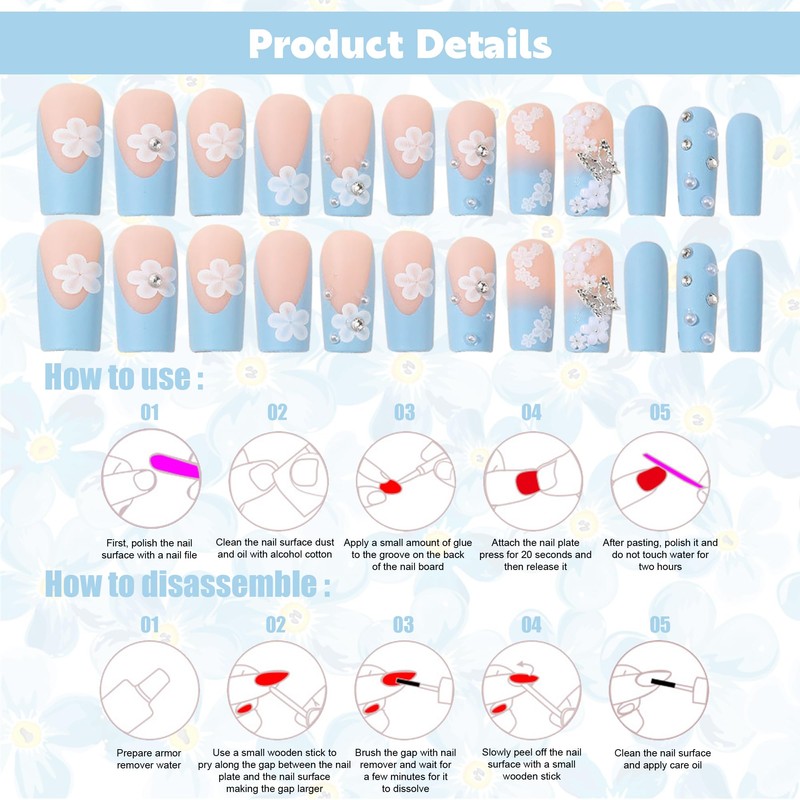 - Flower Press on Nails, Perfect Fit for All Nail Sizes: These 24 Pcs press on nails blue, long nails press on, nails long come in 12 different sizes (0.25 x 0.76 inches to 0.51 x 1 inch), making it easy to find your perfect fit.