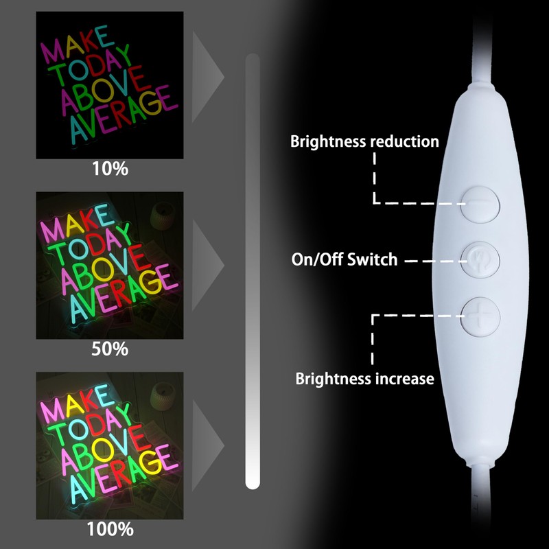 - Adjustable switch: The neon sign has an adjustable lighting function. The middle part is the control switch. The up and down keys can freely adjust the brightness between 10% and 100%, easily adapting to different scenes and atmospheres. Note: For a better usage effect, remember to remove the film on the back