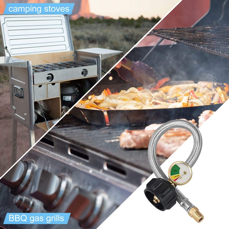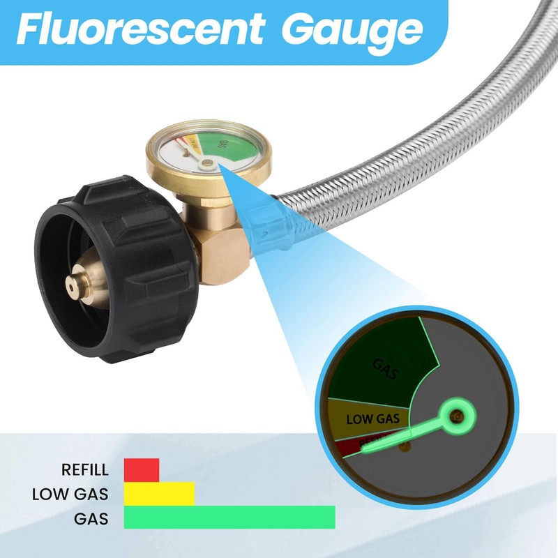 - Monitoreo de capacidad: el medidor puede mostrar la capacidad de propano en el tanque, además, la función fluorescente hace que funcione normalmente en un entorno oscuro, creo que la manguera de propano RV de 15 pulgadas con calibre será un buen ayudante para tu campamento de caravana.
