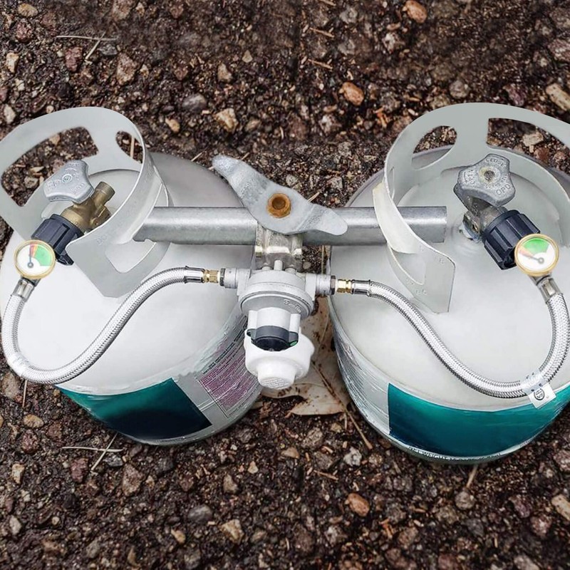 - Usos: conecta dos tanques de propano juntos a través de un regulador estándar de dos etapas (no incluido).