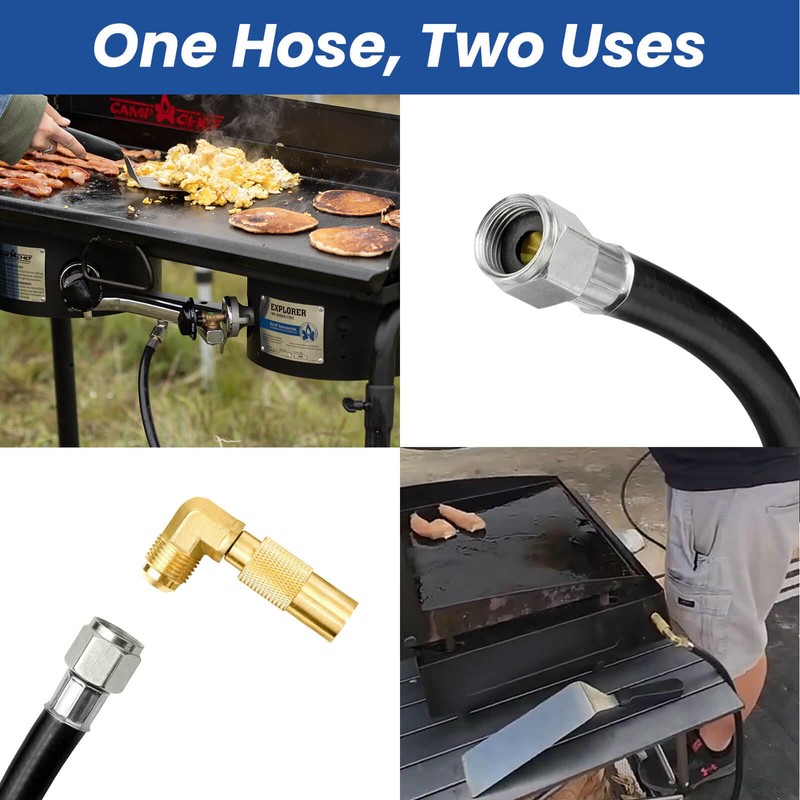 - Múltiples usos: el regulador de barbacoa y el kit de manguera incluye un adaptador de codo de propano de 90 grados. Cuando está conectado, se adapta a sartenes Blackstone de 17 y 22 pulgadas, y cuando no se utiliza, puedes conectar directamente otras marcas de plancha con destello macho de 3/8. El regulador de parrilla y la manguera utilizan el conector QCC tipo 1 y pueden conectar tanques de propano de 5 a 40 libras