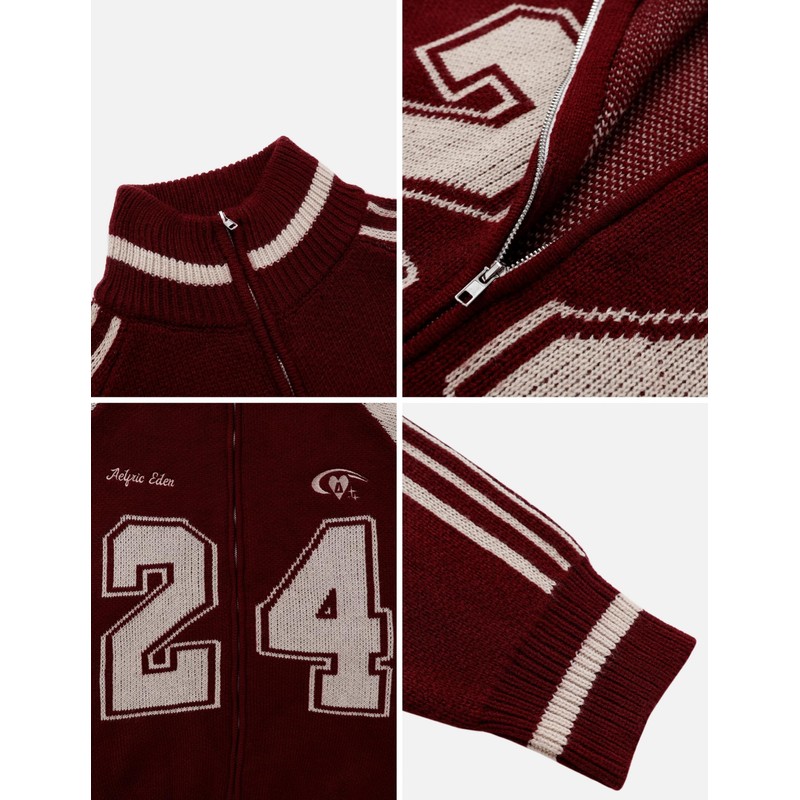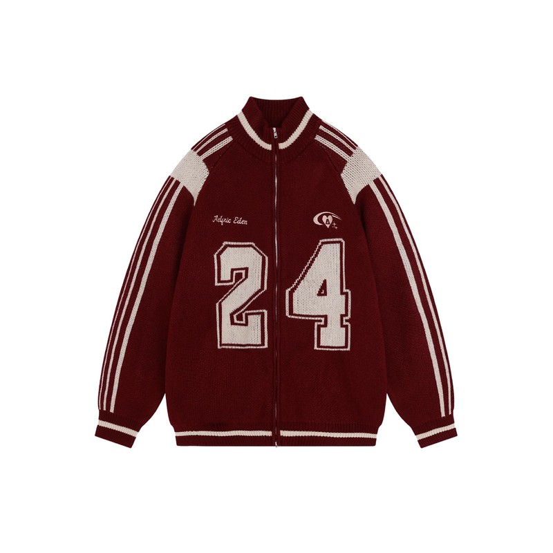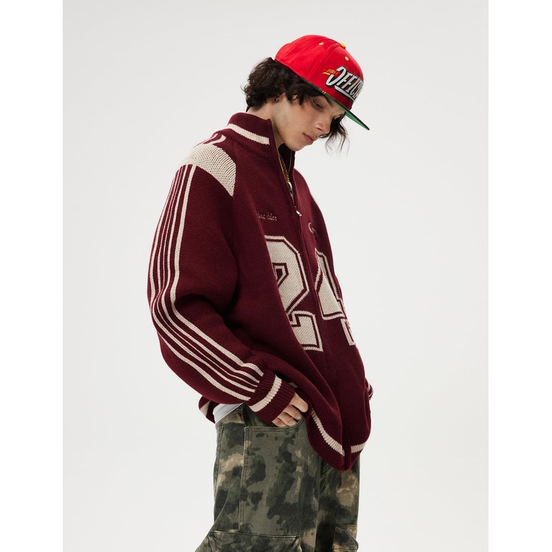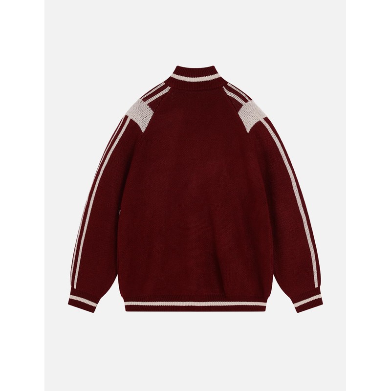 Retro contrast colors and stripes, a unique deep red color paired with vintage number jacquard patterns, highlighting a natural and sporty casual vibe.