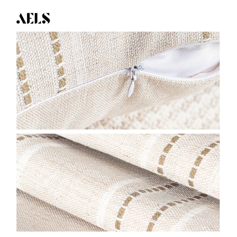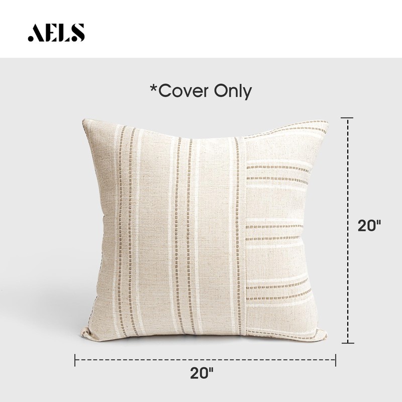 AELS 20x20 Decorative Farmhouse Linen Throw Pillow Covers, Boho Textured Pillow Case, Set of 2, Beige with White & Brown Stripe Patchwork Cushion Cover for Sofa Couch Living Room (Cover ONLY)