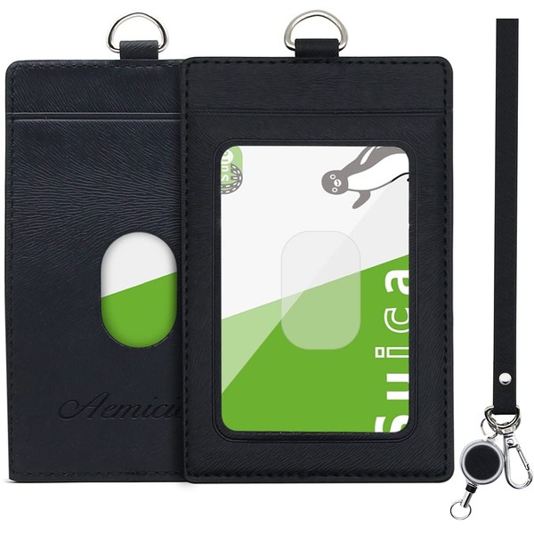 Aemicion Pass Case, Pass Holder, Reel Included, Strap, IC Card Case, Card Case, Leather, 2 Sided, Men's, Women's, Commuting to Work or School, black