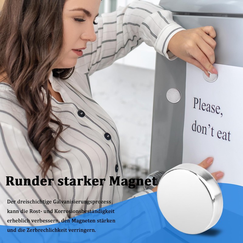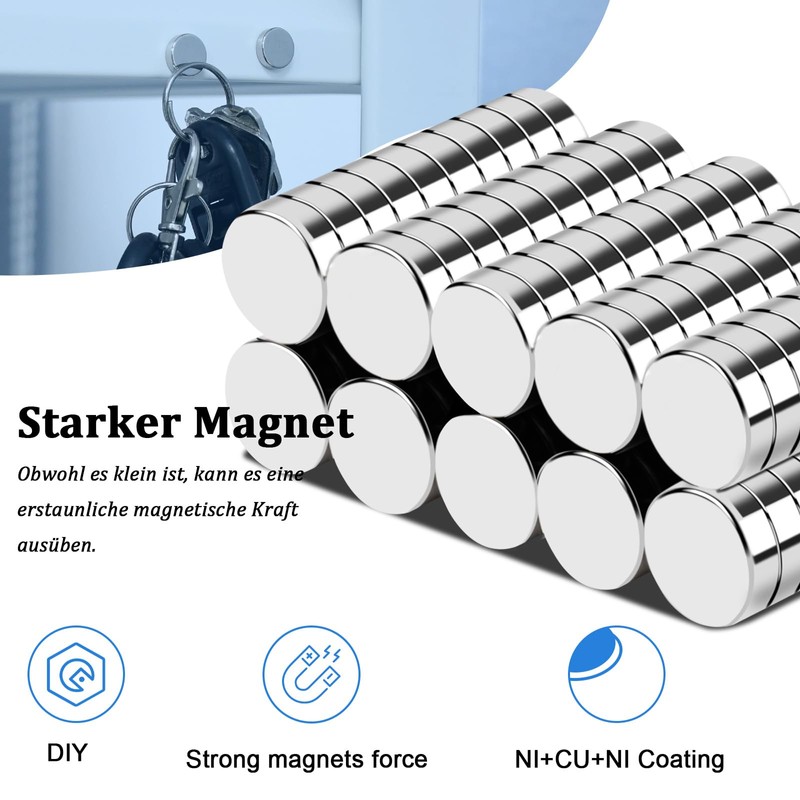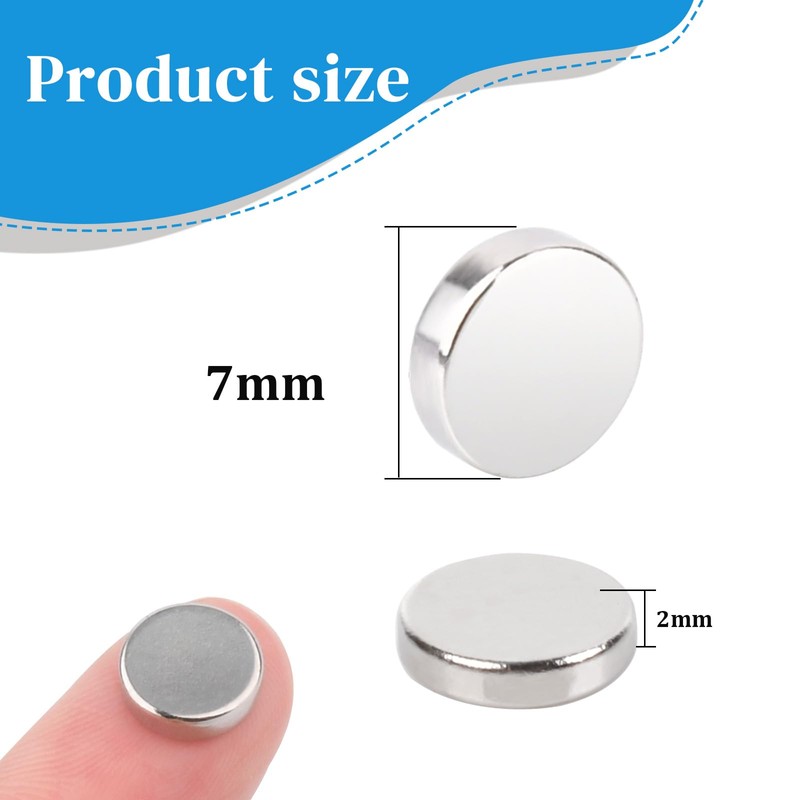 - Strong neodymium magnets: these 100 small round magnets with a size of 7 x 2 mm are made of neodymium and offer a strong adhesive force.