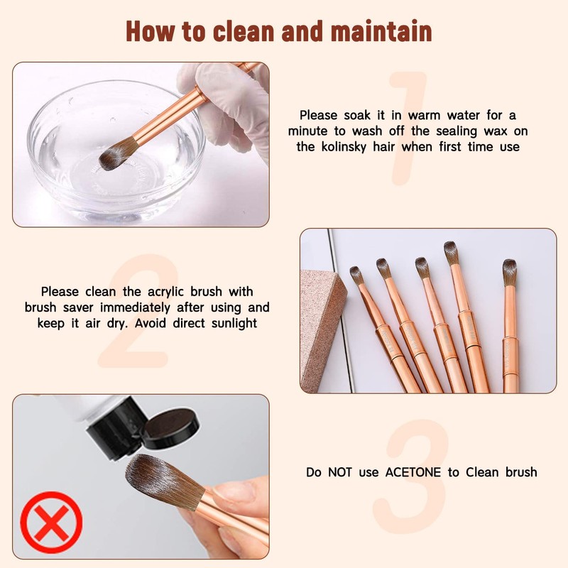 - ❤NOTES: 1.Cuando se utiliza por primera vez, por favor, remoje en agua caliente (por encima de 176 ° F) durante un minuto para lavar el lacre en el pelo Kolinsky. 2.Por favor, lave el cepillo inmediatamente después de cada uso. 3.NO USE ACETONA, porque le quitará el brillo al cepillo.