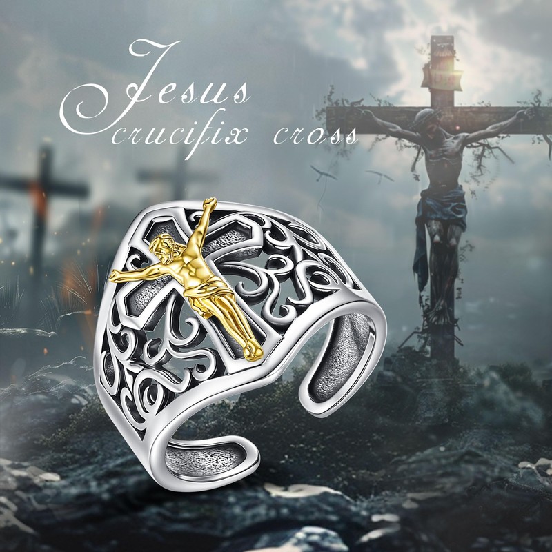 - Jesus Cross Ring: This ring features an impressive golden sculpture of Jesus on the cross, symbolizing His supreme sacrifice and limitless love. As a timeless symbol of salvation, it serves as a powerful reminder of strength, grace and spiritual devotion.
