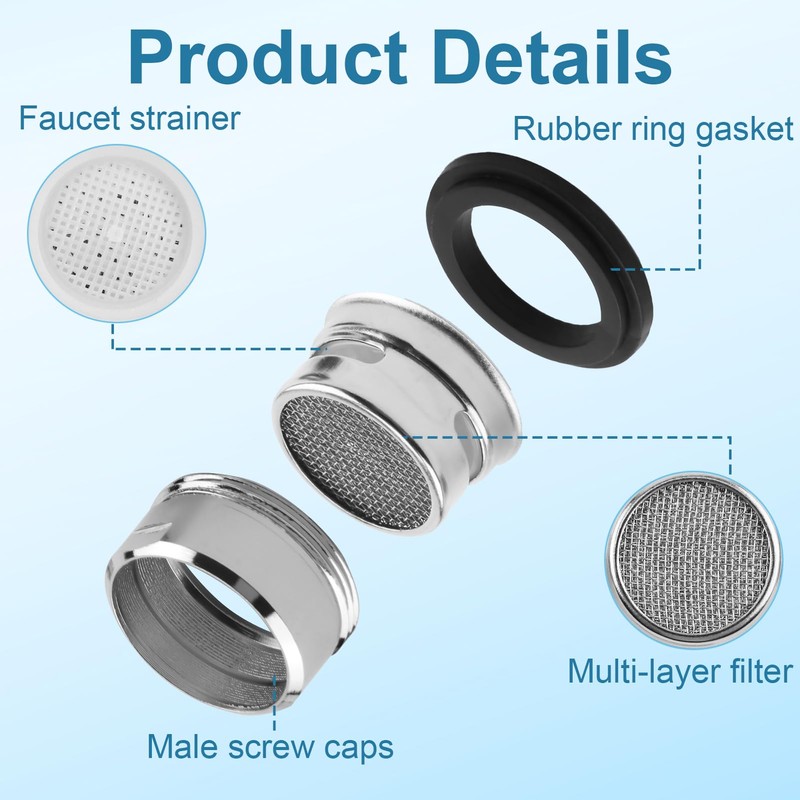 - Complete Accessories for Easy Installation The package includes 6 pieces faucet attachments, 8 pieces gaskets and 1 piece chrome plated carbon steel faucet wrench. This comprehensive list of accessories makes installation easier and ensures safe and durable installation of the water saver on various taps.