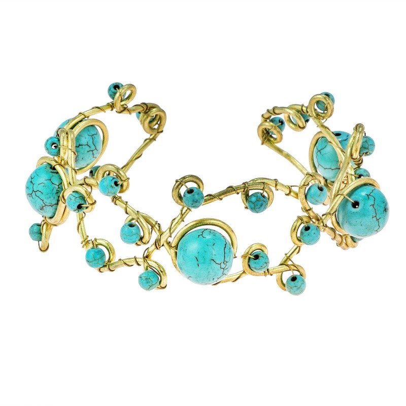 - Material: Brass, Jewelry Wire | Stone: Simulated Turquoise | Color: Cyan Blue-Green | Clasp Type: Adjustable Open-Ended Cuff