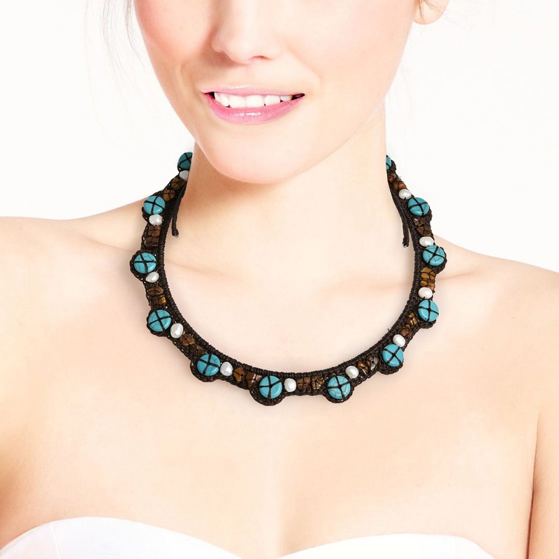 AeraVida Pretty Hemp Simulated Turquoise & Tiger's Eye & Cultured Freshwater White Pearl Expandable Choker Necklace
