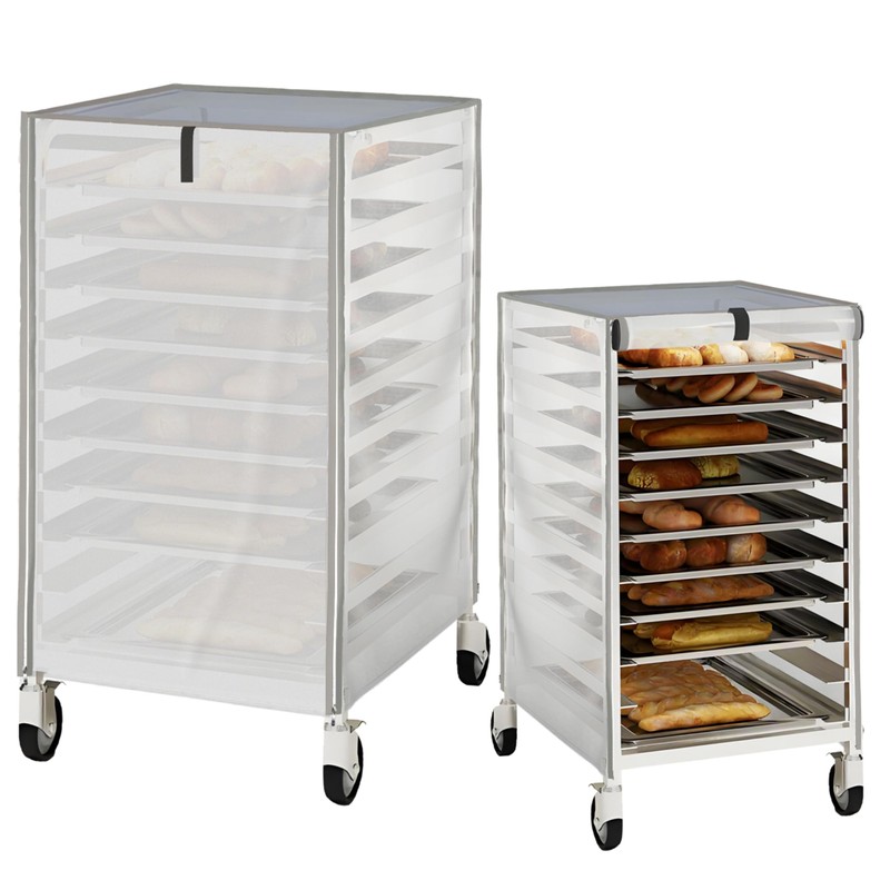 - SIZE: Our cover measures 23"*28"*64"(59x72x163cm)/23"*28"*32"(59x72x82cm), suitable for 20/10-layer baking tray/bread pan rack, easy to use, just put it on to complete the installation. Open to access items simply zip. No complicated steps.