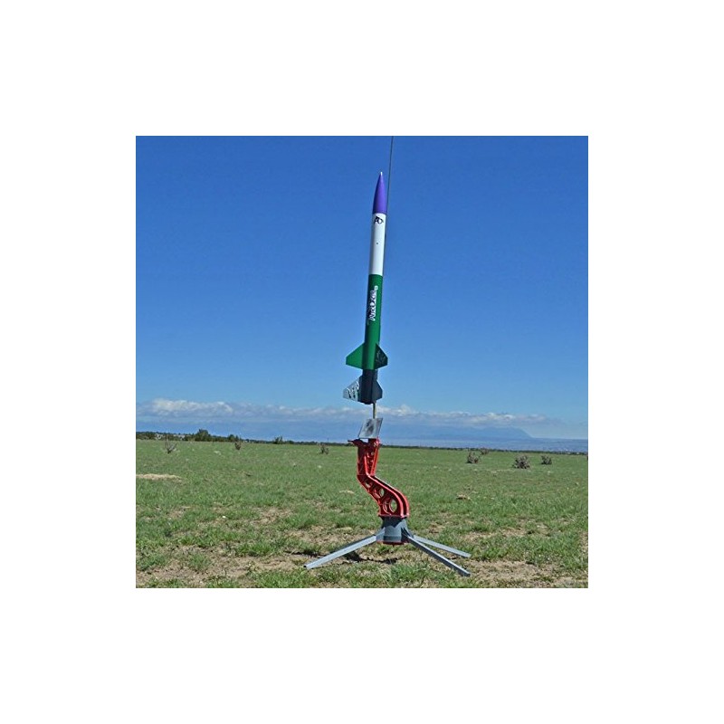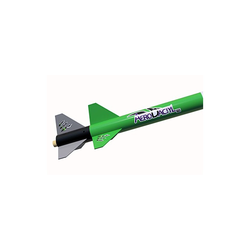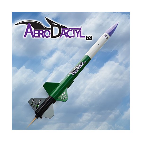 The AeroDactyl Two-Stage (TS) is a simple to build model designed specifically for the lower thrust black-power motors from Estes. Fly it to create a huge billowing column of smoke. Can also be flown as a single stage rocket using composite motors for a higher speed flight. The AeroDactyl TS (the 'T.S.' stands for Two-Stage), is a big and bold rocket designed specifically around the Estes 29mm black powder rocket motors. Those motors (the F15 and E16) are low thrust, so you really need a light-weight rocket to use them. That is what the AeroDactyl TS is, a very lightweight rocket. This is a modern kit, with laser-cut fins, and also laser-cut the slots in the tubes and vent holes in the centering ring so that this kit becomes much easier to build. Also added is a set of pre-cut colorful vinyl decals to really enhance the rocket's appearance. When you fly this prehistoric beast, the rocket lumbers off the launch pad under a huge billowing column of smoke. It is a slow and majestic flight that is sure to please you and the spectators at your next launch. The AeroDactyl rocket has the classic old-style two-stage configuration. The fins of the bottom stage nest against the back edge of the top stage's fins. Two stage rockets are a blast to launch. As it screeches off the launch pad, the bottom stage suddenly pops off about 200 feet into the air. Then the top stage fires and begins its ascent into the air. The extra speed allows the rocket to coast significantly higher into the sky than a normal single-stage rocket. Often, the only indication of the rocket you'll have is the smoke trail coming out of the motor. You might want to have a set of binoculars with you when you launch this rocket. You can fly it either as a single stage or two stage. When flying two stage, use the 29mm diameter black powder motors in both stages. In single stage configuration (just the top section alone), you can use composite propellant motors.
