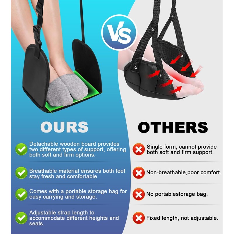 - Easy to use and install: Simply snap the buckle, hang it on the holder of the tray table, then adjust the length you need, then place your feet on it. At the same time, it can be easily folded and stored in the storage bag.