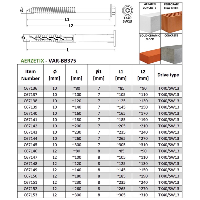 | Size: | Dübel 10x200 mm - Schraube 7x210 mm |