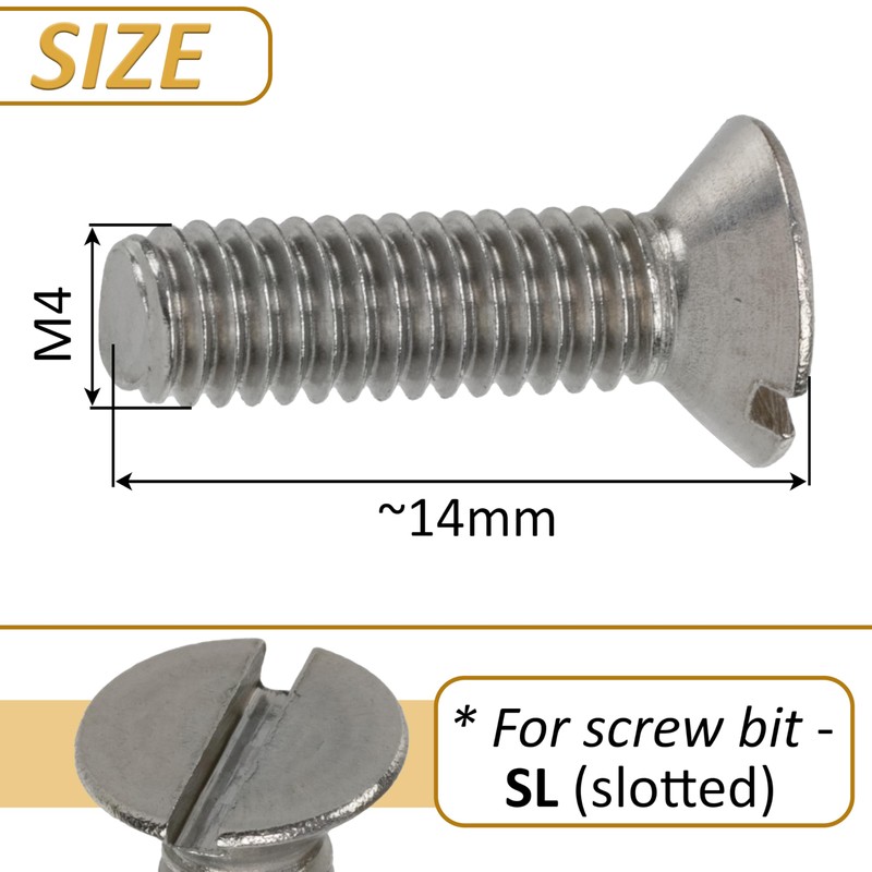 - Dimensions: thread: M4. Length: 14 mm. Imprint: SL. See the pictures. Weight per piece: 1.26 g. Material: steel. Colour: silver.