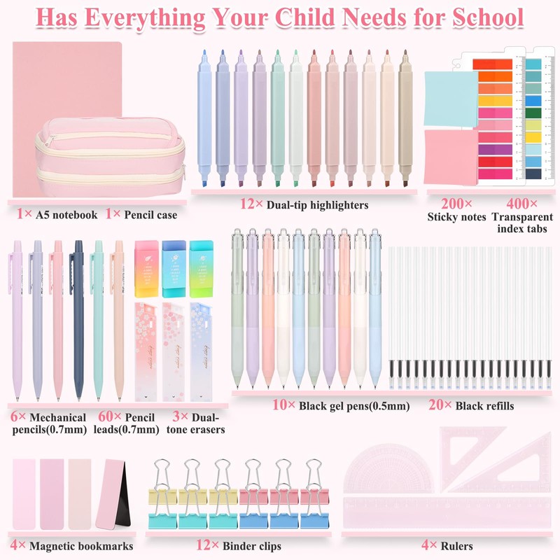 - ✍【Value Aesthetic Stationery Set】This comprehensive secondary school stationery set for girl is packed with all the essentials: 1 pink pencil case, 1 A5 notebook, 12 dual-tip highlighters, 10 black gel pens & 20 refills(0.5mm), 6 mechanical pencils & 60 lead refills(0.7mm), 3 dual-tone rubbers, 4 rulers, 200 pcs sticky notes, 400 pcs clear index tabs, 4 magnetic bookmarks, and 12 binder clips. Big selection of useful stationery makes it great for school, college, university and office use.