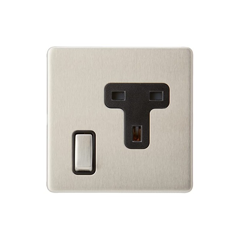 AET SL1GSOCBS Screwless Satin Chrome Flat 1 Gang 13 Amp Socket Black Insert Metal Rocker Switch